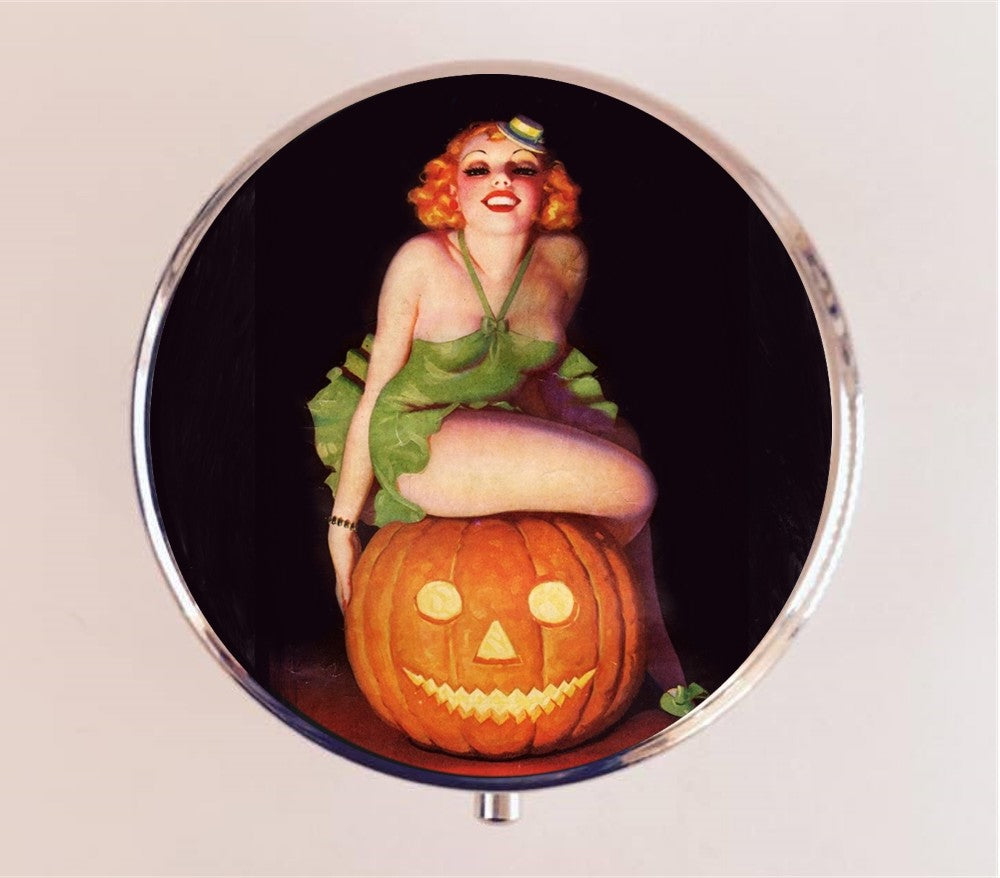 Flapper Halloween Pill Box Case Pillbox Holder Trinket Stash Box Art Deco Pin Up 1920s Jazz Age Pumpkin