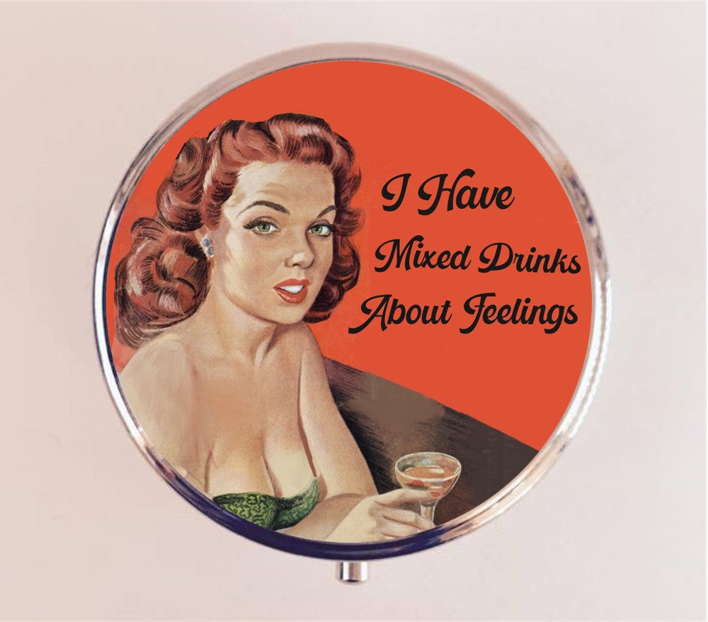 I Have Mixed Drinks About Feelings Pin Up Pill Box Case Pillbox Holder Trinket Stash Box Retro Funny Humor Pinup Pin Up Girl Party Drunk Booze