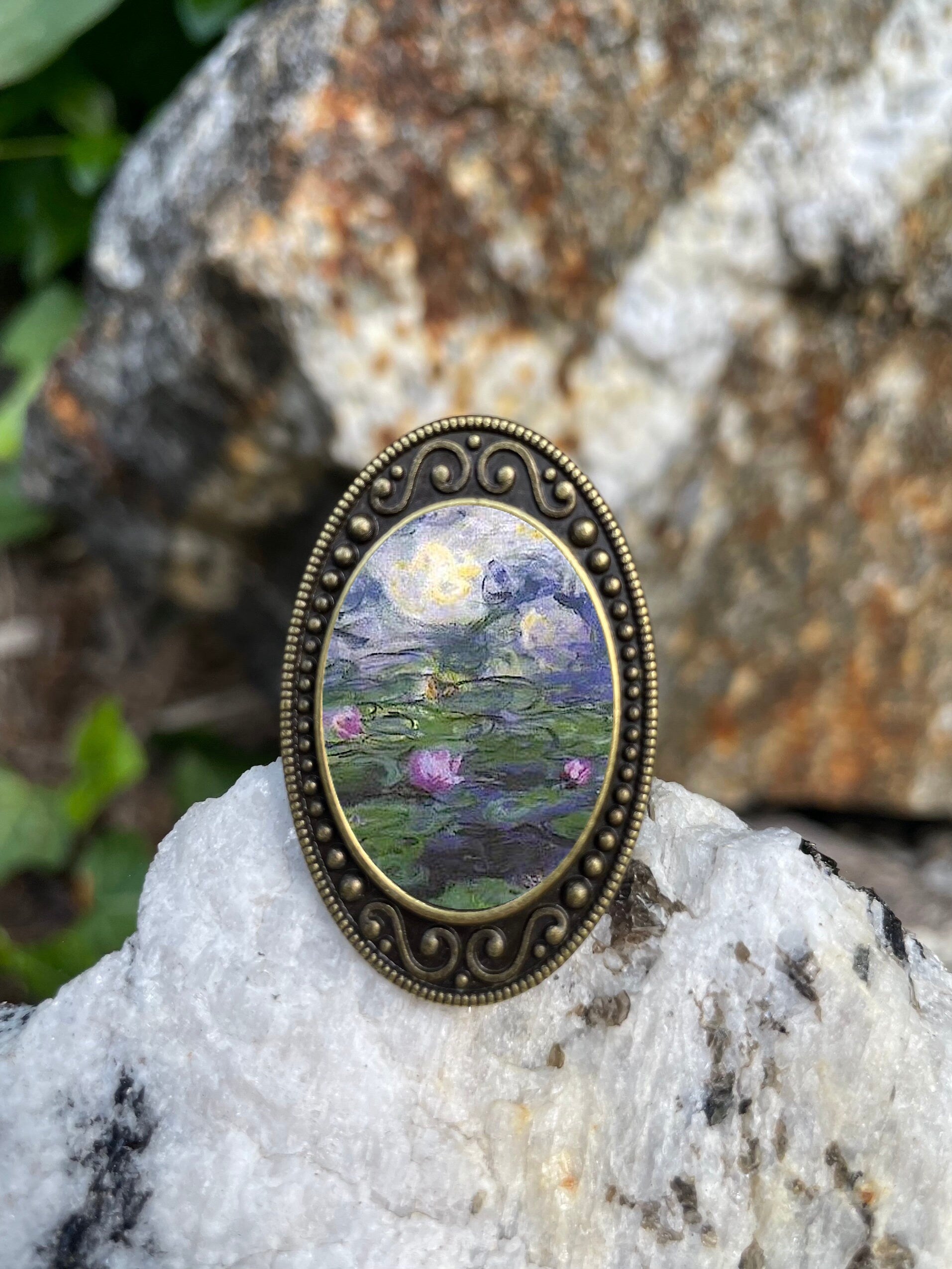 Monet Lilies Antiqued Bronze Adjustable Ring Fine Art Painting Brass