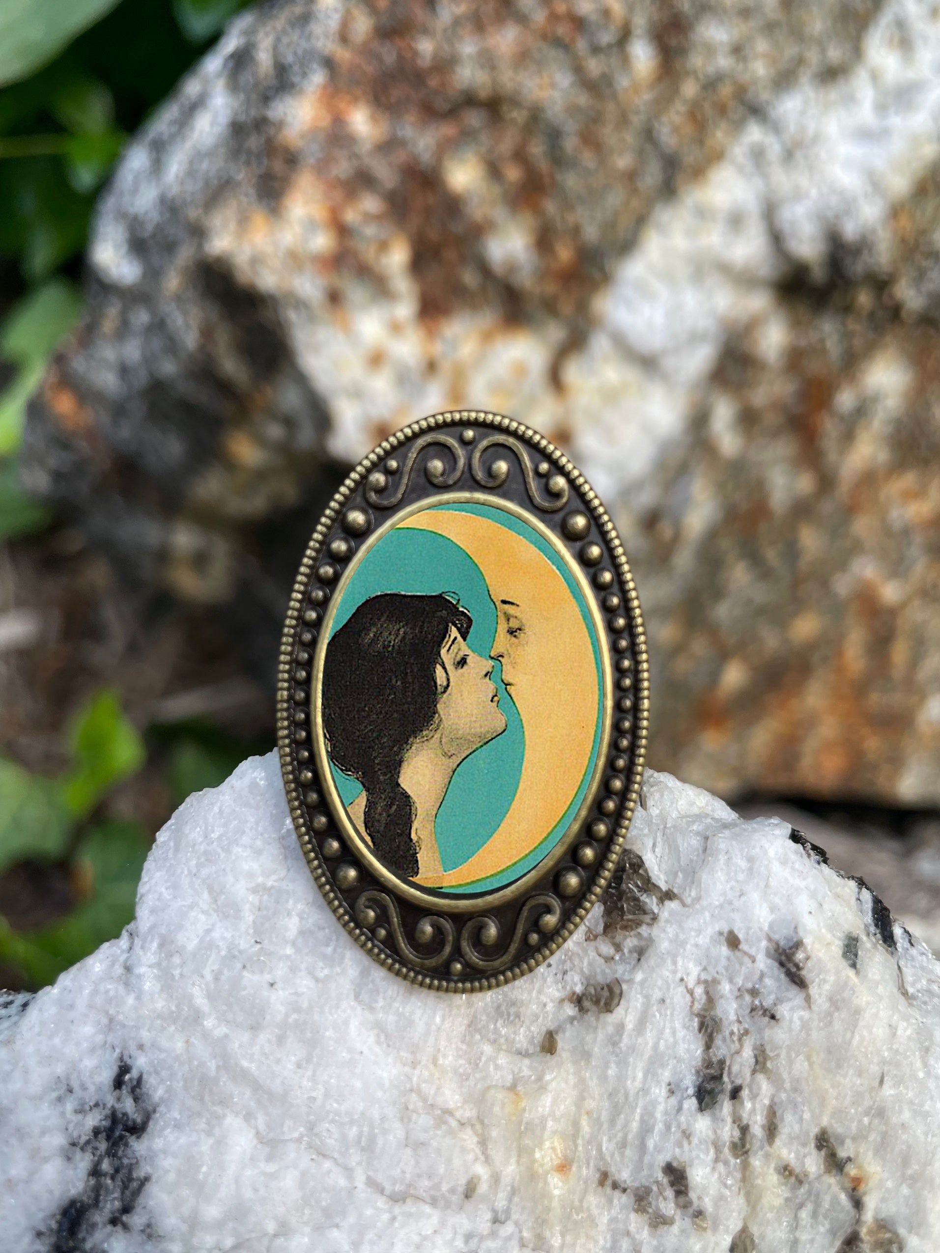 Moon Kiss Antiqued Bronze Adjustable Ring Man in Moon Romantic Art Nouveau Brass