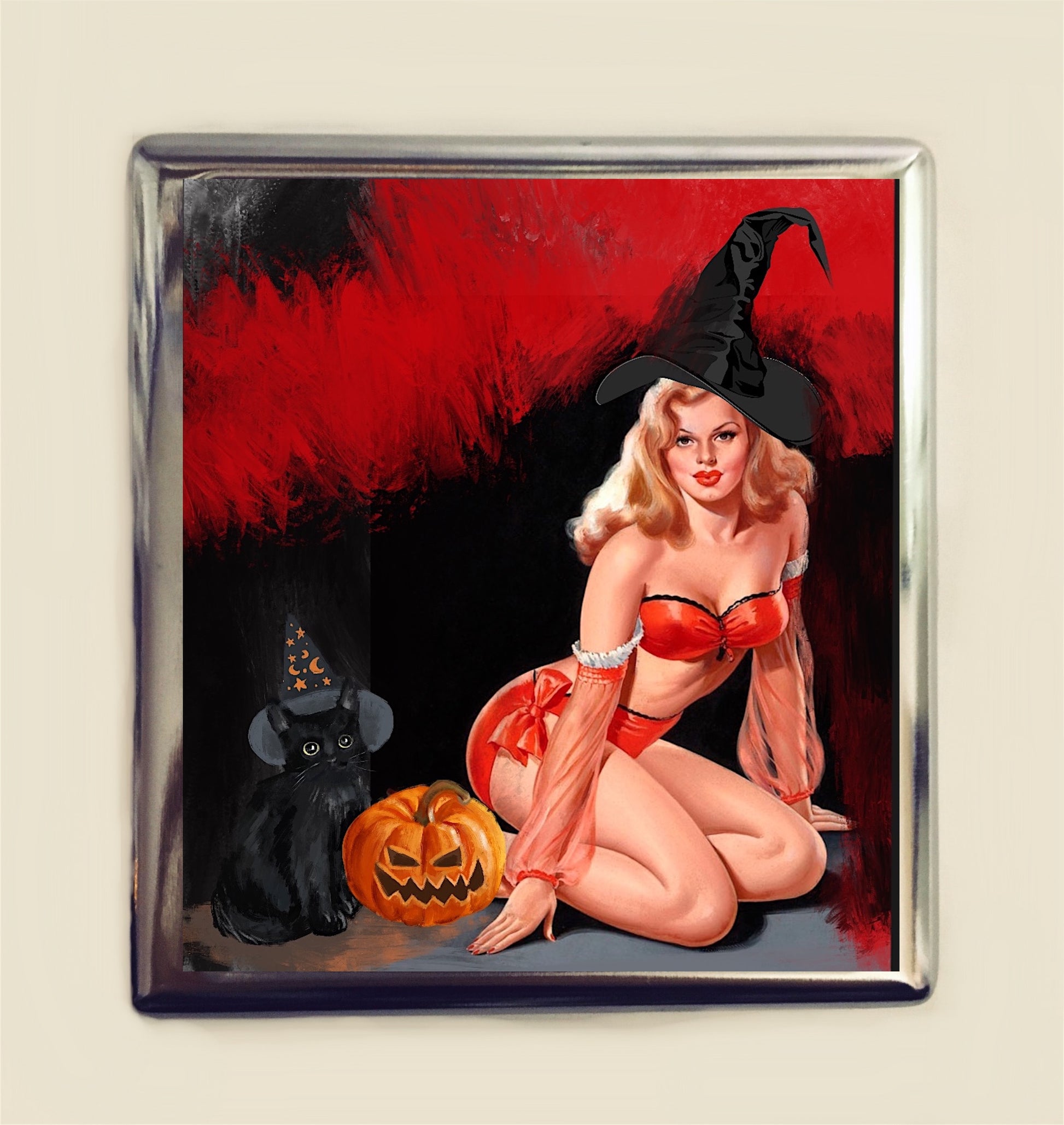 Pin Up Witch Cigarette Case Business Card ID Holder Wallet Pinup Girl Retro 1950s Halloween Black Cat
