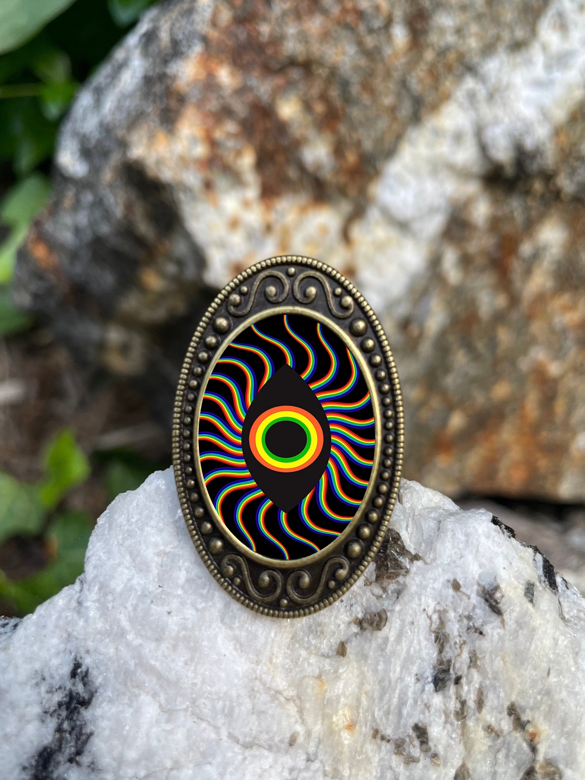 Psychedelic Art Eye Ring Antiqued Bronze Adjustable Trippy Swirly Rainbow Brass
